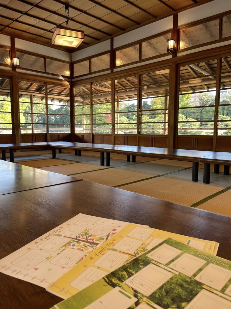 11月19日、紅葉が始まった清澄庭園「料亭」で家系図作成体験会を開催。